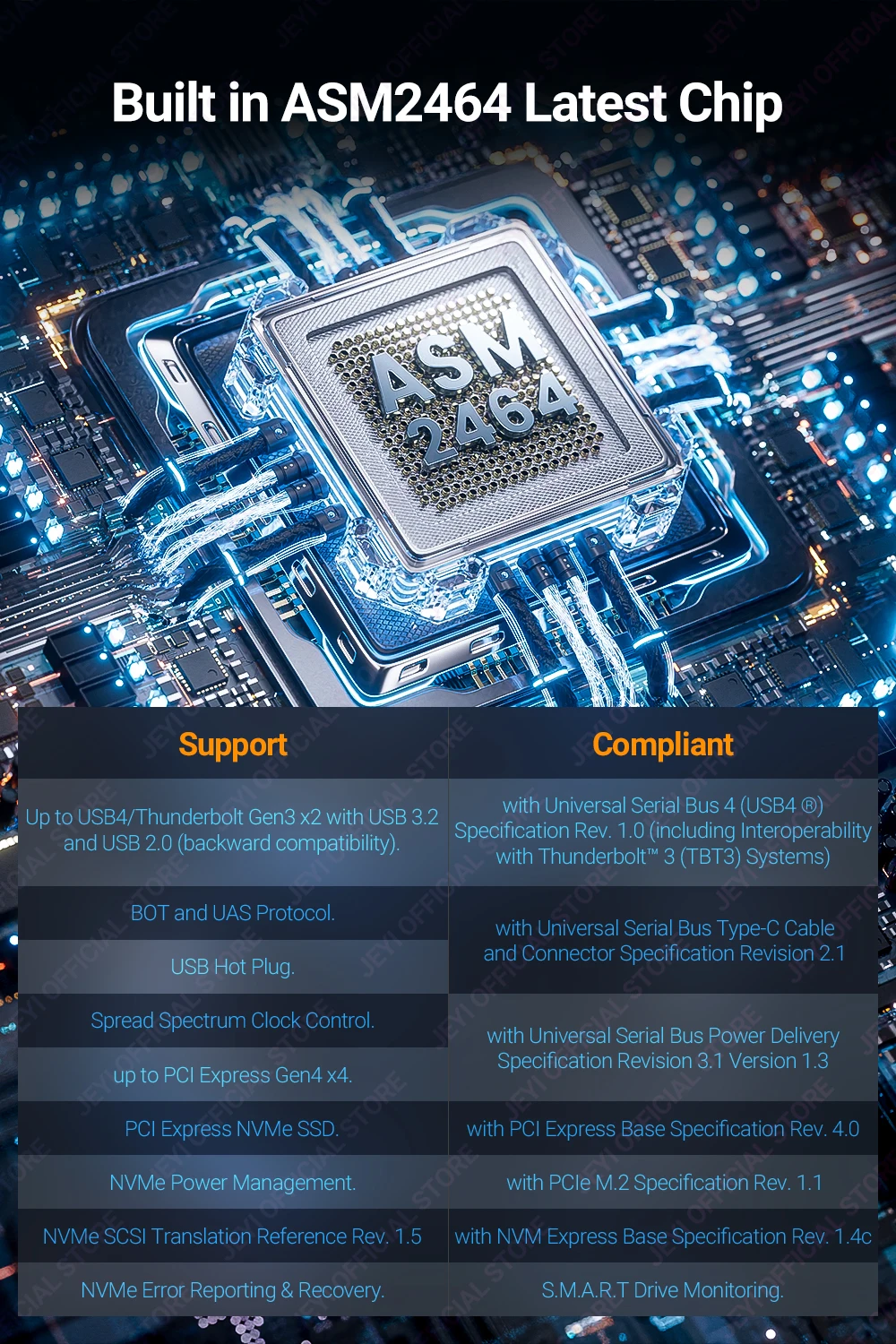 The ASM2464 can combine USB and PCIe Dual Tunnels, giving this JEYI M.2 enclosure stronger adaptability and making it suitable for a wider range of use cases.